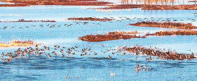 在湖堤转角处,我遇见两位银发老者。“几十年前这里是猎枪对着的地方”,他们指着对岸山丘轻声说。此刻那山峦却恢复安然静谧,倒卧在水中,被波纹揉成一匹青绸。无数豆雁突然腾空而起,将山的倒影搅碎成满湖碧玉。